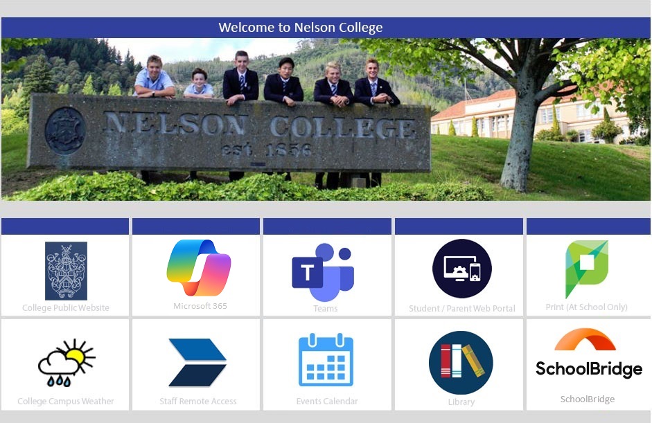 College Public Website Staff Access Notes Microsoft Teams Sign In to Microsoft 365 Nelson College Weather Station Nelson College Library Student / Parent Portal SchoolBridge Print (At School Only) Events Calendar SchoolBridge